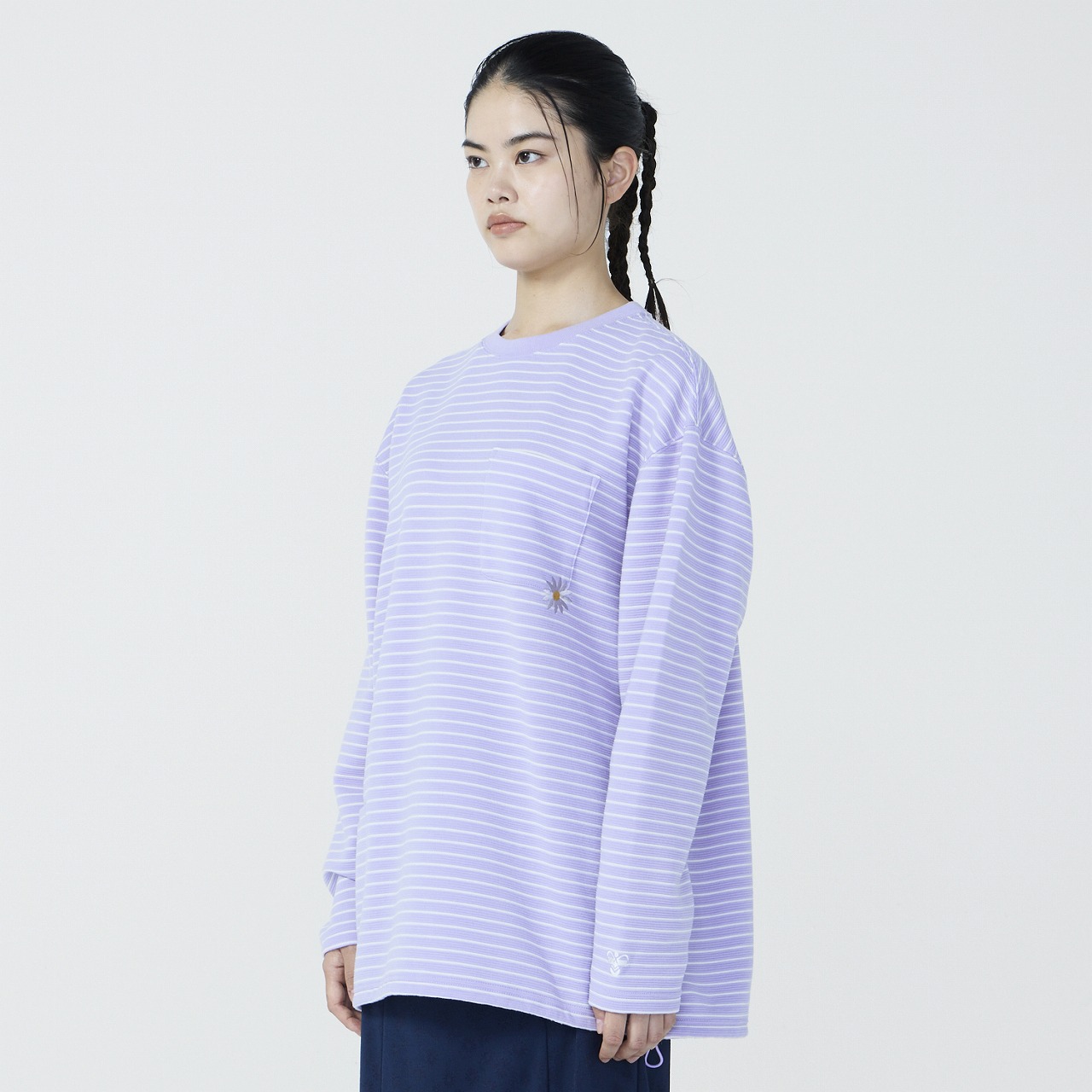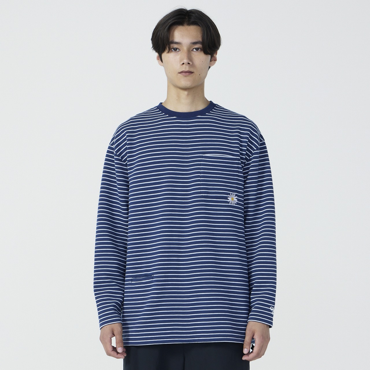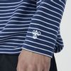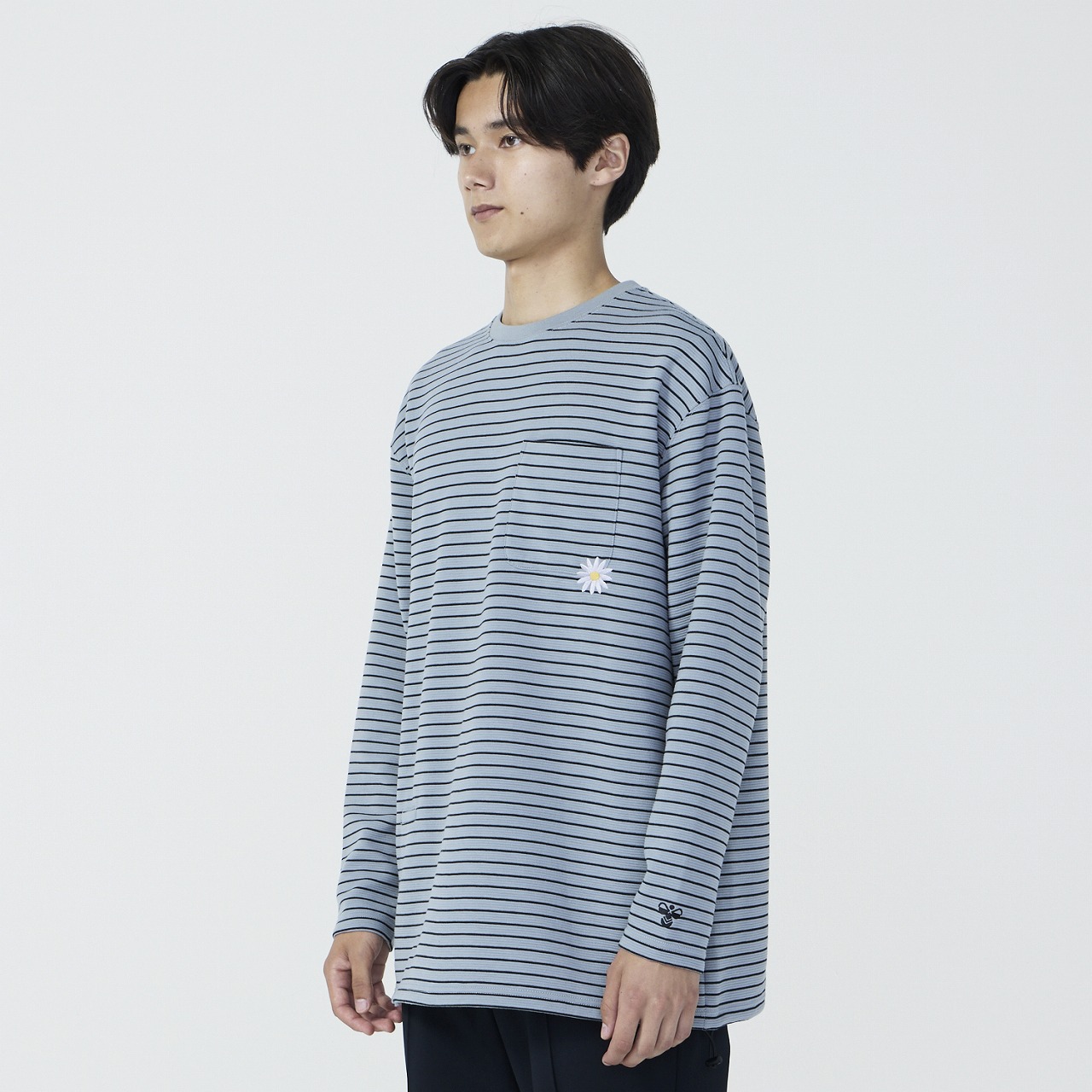 ポリエステル素材の長袖ボーダーTシャツ。吸汗速乾素材で汗をすばやく吸収し、発散、快適な着心地が持続します。リラックス感のあるゆったりシルエットで、ポケット付近のマーガレットフラワー刺繍がポイント。裾周りにはゴムスピンドルが入っており、シルエットの変化を楽しめる仕様。カジュアルにもキレイめにも着用できるアイテムです。