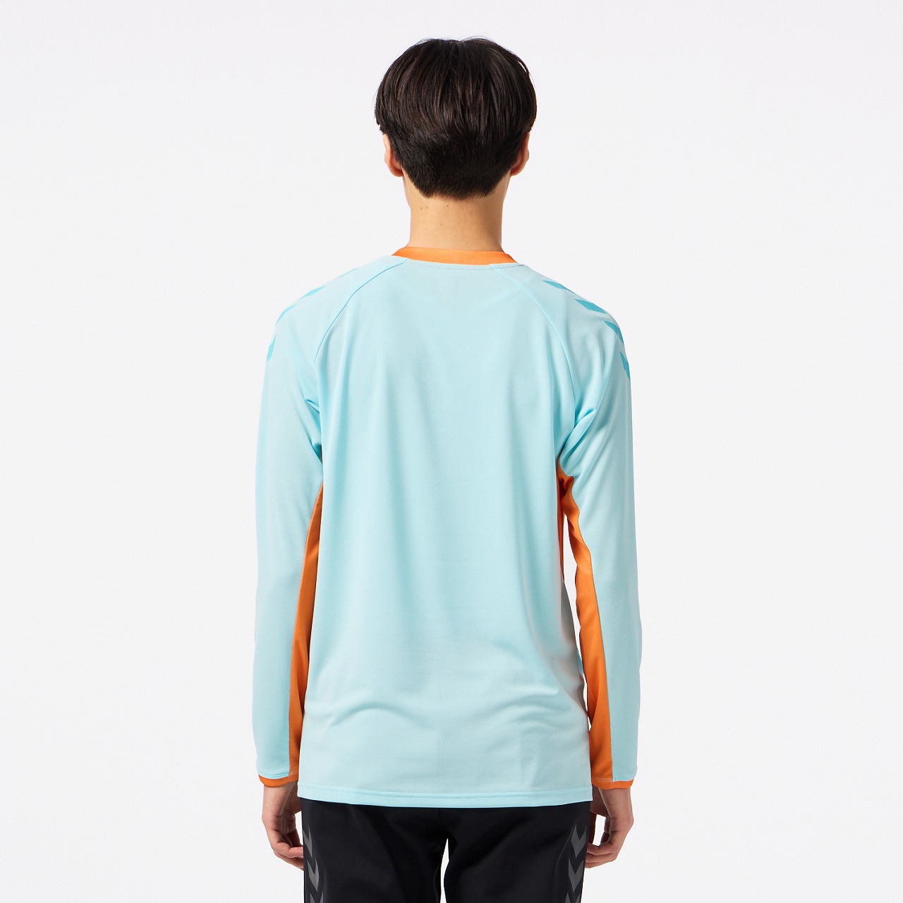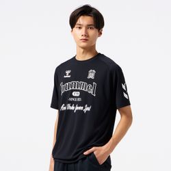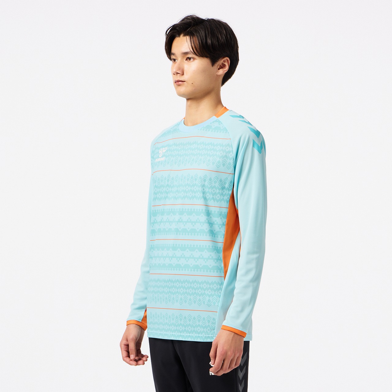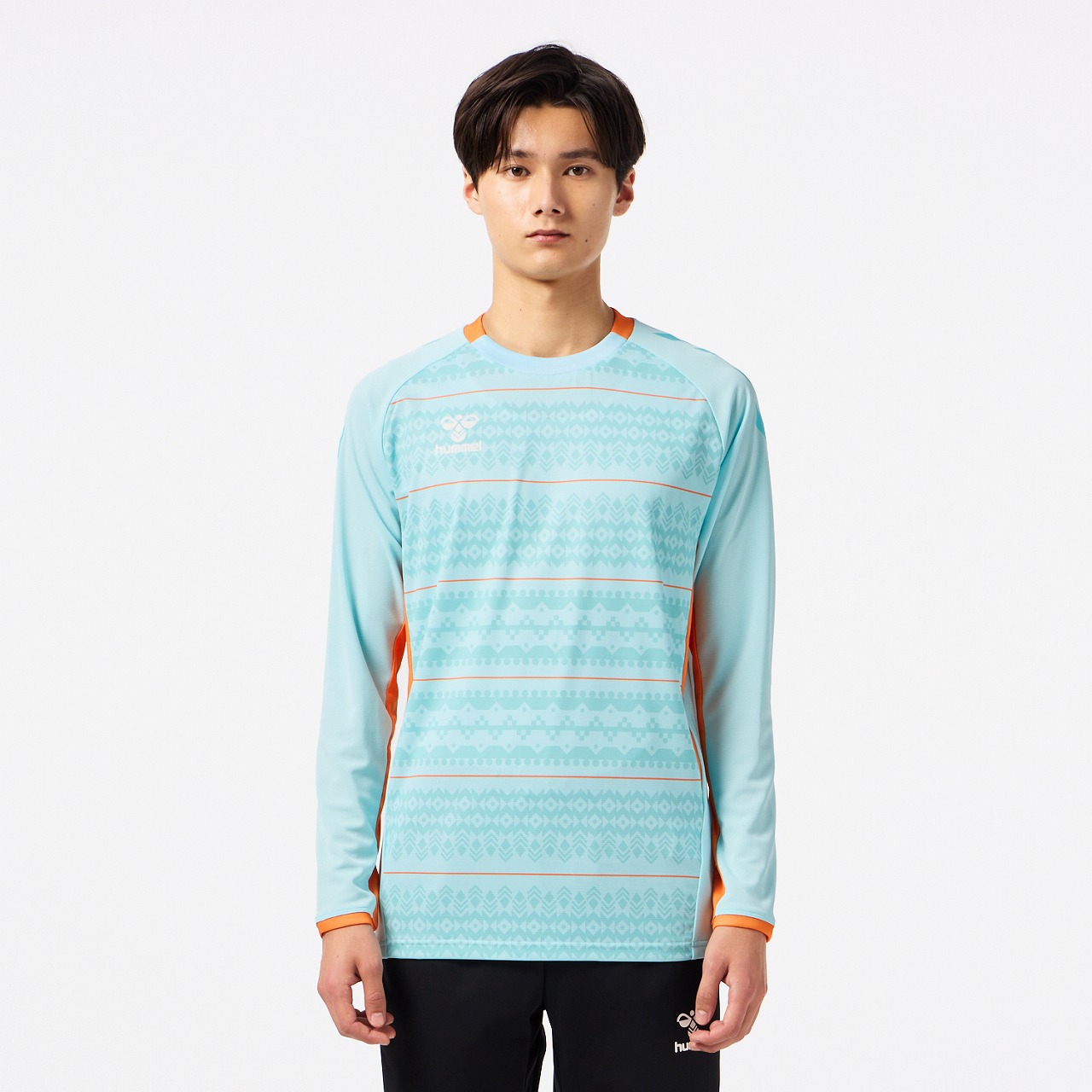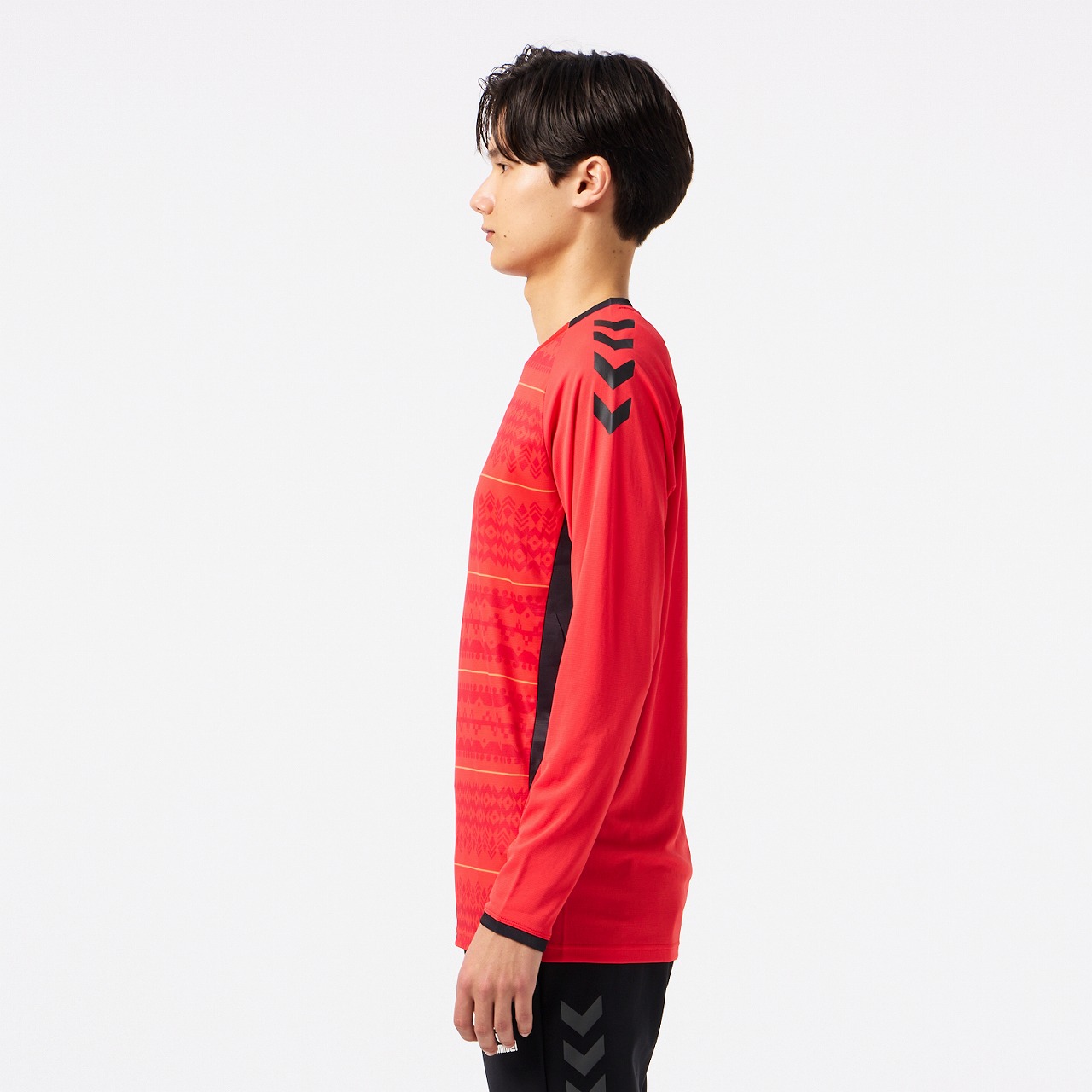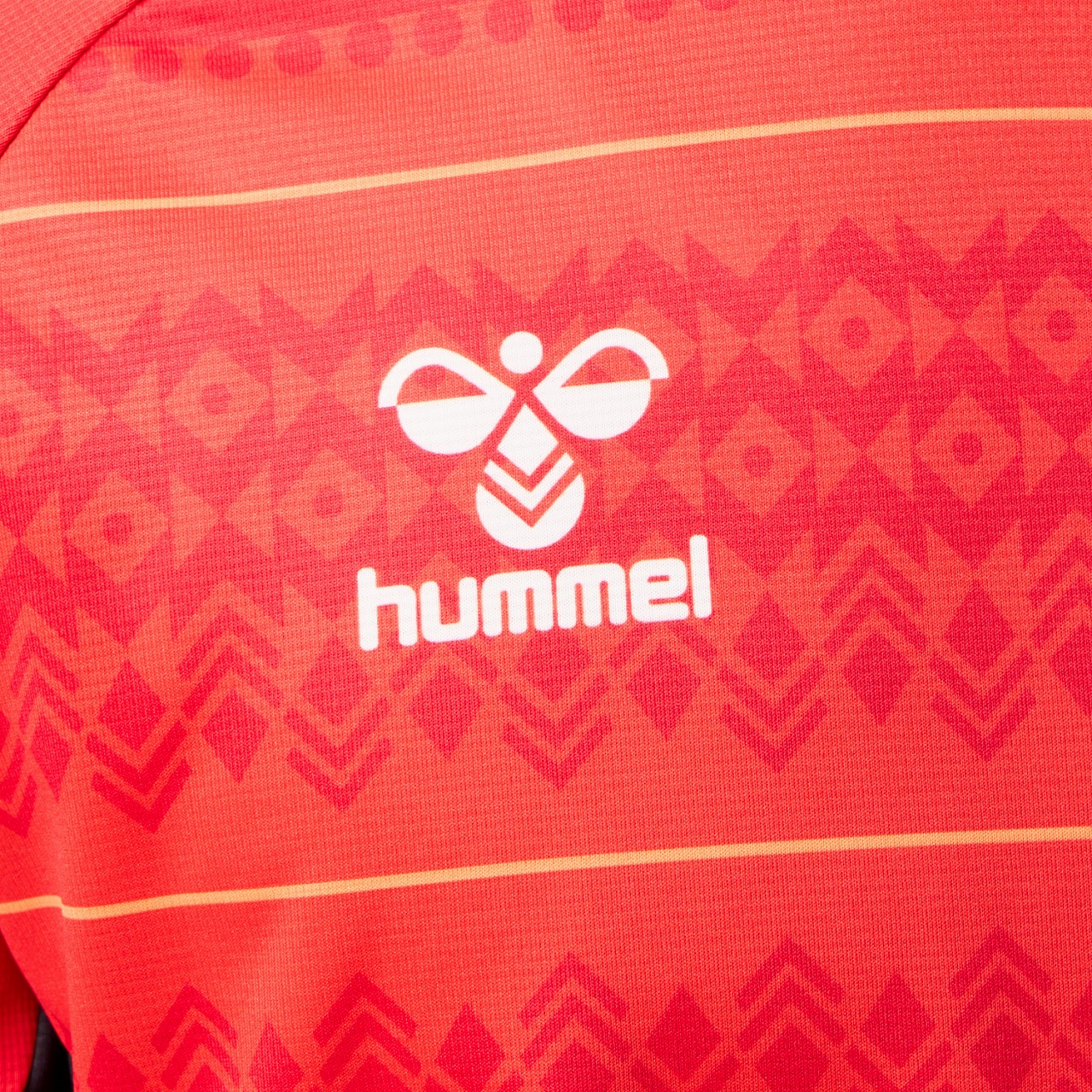 汗をかいたときの肌への張り付きを軽減する肌面撥水糸を使用した素材を採用。また、吸汗速乾素材で汗をすばやく吸収し発散、UVカット効果もあり、プレー中の不快感を軽減させ、快適な着心地を追求します。ヒュンメルのバンブルビーロゴの要素で構成されたノルディック柄を採用したアイテムです。